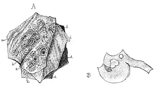 nary flat films; the outlines are sometimes very singular, being made up of most eccentric curves in all sorts of combination. In one or two instances these scales overlapped, showing that the disintegration had taken place in a spiral direction (Fig. 10, B). This world of beauty, in both colors and form, was found within the area of one square inch or less, on a small fragment of no special brilliancy to the naked eye.