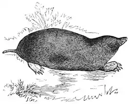 Fig. 1.—Mole Shrew. States. In the genus Blarina (Gray) the body is stout, the tail shorter than the head; the skull is short and broad, and the fore-paws are large in proportion to the hind-paws. This genus is peculiar to America. The mole shrew (B. talpoides, Gray), the largest of the American shrews, four and a half inches long, is found from Nova Scotia to Lake Superior, and southward to Georgia. It is dark, ashy gray above and paler below, with whitish feet. Several other species are described by Baird, of which two are in Mexico and Texas.