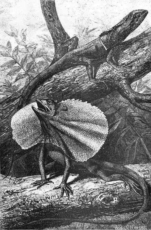leaps. It is essentially a tree-inhabiting animal, though it can run very swiftly along the ground. According to Captain Grey, who observed it in nature, "when not provoked or disturbed it moves quietly about, with its frill lying back in plaits upon the