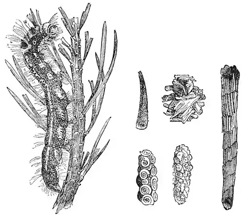 They devour, and they gorge themselves, without taking any care to protect their existence against aggressors from without. But a more provident minority construct shelters for themselves—little movable houses which the animal carries with itself, and within which it withdraws in case of danger, like a turtle in its shell. The larva fixes itself to this refuge by means of its membranous legs, and moves without by its articulated legs. The materials necessary for the construction of the nest are gathered up in the element in which the animal lives. They are twigs, grains of sand, fragments of shells, collected in water by the Phryganeidæ, shreds taken from our cloths by the Tineidæ; earthy substances by the Chythra; and all are glued together by the secretions of the insect.