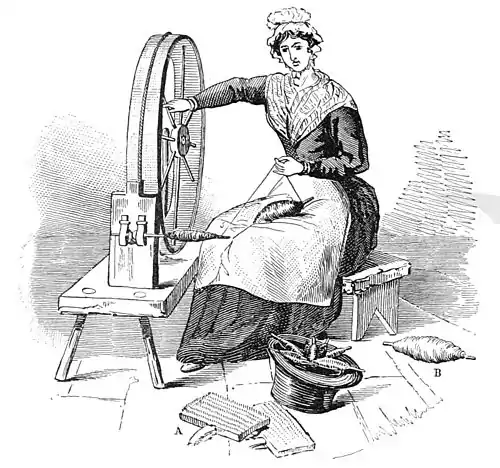 Fig. 10.—A Wool Spinning-wheel. A, hand-cards; B, bobbin of roving.