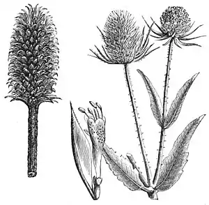 Fig. 29.—Head of Fuller's Teasel, and Heads of Wild Teasel. and pliant teasels, which raise the fibers by a series of rollers, capable of adjustment according to the amount of nap it is desired to raise. The gigging machine also, while not originally an American invention, has received from Americans its most valuable features. As early as 1794 Walter Burt obtained in America a patent for a gigging-mill in which the rotating barrel was the distinguishing part; and the names of Jersey, Christie, Olney, Barrows, Beck, and Wells are honorably identified with its subsequent development.