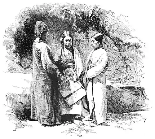 And we may select a last example from Egypt. Loret says the ancient Egyptian women had blue hair, green eyelashes, painted teeth, and reddened cheeks. He says the modern Egyptian women are much the same; they tinge their hands with henna, and prolong the eyes by means of kohol; they stain the nails brown, and paint blue stars on the chin and forehead. "One hesitates a little about putting his hand into a hand—even very small—which extends itself to you painted a brick-red. One is