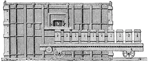 ing furnace.[1] Nevertheless, they succeeded in producing in it cast steel of excellent quality, of a variety of tempers, for which they were awarded a gold medal at the French Exhibition of 1867. The success of the Messrs. Martin, together with the fact that patents had been granted them for certain details of manipulation, brought about a combination of the interests of the Messrs. Siemens and Martin in the process, which has come to be known as the "Siemens-Martin open-hearth process." The construction of a small furnace for conducting this process is illustrated by Figs. 55 and 56—the first being an elevation showing the "ingot molds." arranged in order upon a traveling carriage, k, by which they are successively brought under the "tapping spout," b, to