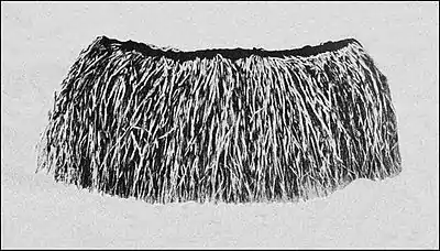 few holes in a line with each other and passes a sinew fiber through them, casting a single hitch over each hole but leaving the thread loose. Two or three such holes being made and the thread passed through, he draws it tight so as to produce a sort of lock-stitch, perfectly safe and neat. Finally, he rubs down the seams so that the edges lie as if one piece. The gray jackal is more prized than the black; though not so beautiful, it is more rare. One kaross, five feet three inches deep by three feet wide, was made of several skins. The skin is darkest along the back. The maker has here selected skins and uses the darker ones for center and lets it fade away toward the edges to give the effect of one large skin. Not only so, but by careful cutting and piecing the effect was carried out. All the heads are set in a row along the upper edge. The lower edge is made from the skin of the paws—very dark, in a stripe four inches wide. In some karosses, two feet from the top and on the outer edges, are small wings or projections, one foot long by eight inches wide. These wrap around the shoulders and arms. The kaross reaches the knees in front and a foot lower behind and at the sides. The edge of the kaross is bound on the inside with membrane band to add to its strength. This is made from antelope-skin, rolled up and buried in the ground until partly putrefied; it is then split. The needles used are like skewers and eyeless. The thread is of sinews—the best of which are from the