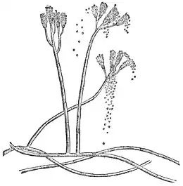 With such a microscope I saw transparent, branching, interlacing threads, called hyphæ, and thousands of loose spores. Many of the threads ended in little tassels. These tassels I found to he formed in a very interesting manner. First, the creeping hyphæ, send branches into the air. Then these branches bear each three or four branchlets. From the ends of the branchlets grow a number of fine, parallel threads called sterigmata. The ends of these