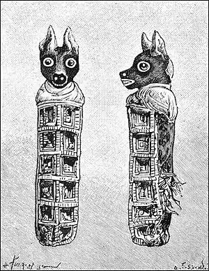 Fig. 4.—Egyptian Mummy of a Dog with Pasteboard Mask, recently discovered by M. Beckmann. Front and Profile Views. to the skin by a thick layer of bitumen. Over this envelope they had applied a thin mat of dried reed-stems like those which are found on many human mummies of the twentieth dynasty and later, fastened by a long cord of braided grass. The animal, thus bundled up, presented the appearance of a cylindrical mass, or of a veritable basket of game, with both ends left open. A decent shape had to be given to this queer-looking package. A network of fine cloth was thrown over the part which answered to the body, so arranged as to design parallel rows of superposed squares along its length; a kind of ornament which is found on many mummies of small animals, as of the cat, ichneumons, the ibis, and the hawk. According to usage, the head was covered with a pasteboard mask, in which the physiognomy of the animal was reproduced as far as possible. It was painted a dark brown, except around the eyes, the lips, and the nostrils, which were white. The half-opened mouth showed the points of the teeth, and the ears rose above the head.