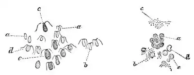 Monas Dunalii magnified.a. Very young individuals, colorless. b. Individuals not yet full grown, colored green c. Adults very deep red. d. Adults of lighter red. Monas Dunalii,dead, and of globular shape.