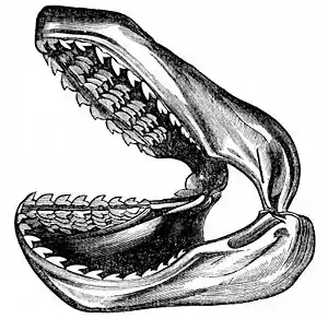 head. As soon as we got him on board, he sent about three feet of the ship's bulwarks out by a lash of his tremendous tail—which was cut off by the boatswain with a hatchet, while a dozen of us with bowie-knives finished him and opened his maw. Inside we found six large snakes, two dozen lobsters, two empty quart-bottles, a sheepskin and horns, and the shank-bones of beef which the cook had thrown over-board two days before. The liver filled two large wash-deck tubs, and when the cook melted it down we got ten gallons of oil, which sold at Brisbane at 4s. 6d. a gallon." When his remains were thrown