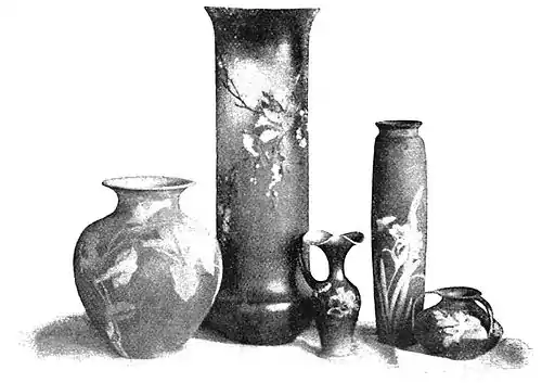 bodies, produces the effect of rich tones of black, yellow, green, red, brown, and amber, harmoniously blended, of great depth and strength. A number of competent artists are constantly employed m beautifying the wares, the decorations being entirely underglaze. Mr. Kataro Shirayamadani, a Japanese painter of the best school, is doing some of the finest work in Oriental methods. Mr. A. R. Valentien, Mr. M. A. Daly, and others rank among the best American decorators in their particular lines. The above engraving will give a fair idea of some of the forms of vases produced, but no adequate conception of the great beauty of the glazing can be conveyed in black and white.