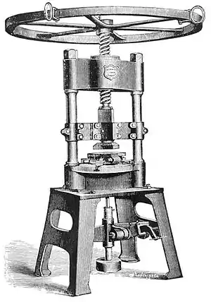 Fig. 43.—The Wilkes Screw Tile Press. tiles she is sadly deficient. This is a branch of the art that must be developed through the influence of our mechanical art schools, which are paving the way for an early revolution in the ceramic industry in the United States.
