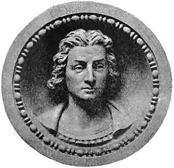 Fig. 49.—Medallion of Columbus. and gable work in the library of the University of Pennsylvania, and the Drexel Institute, now being erected in West Philadelphia. A series of animal-head medallions, in high relief, are particularly excellent, and some bas-relief portraits of eminent men, modeled by such sculptors as H. J. Ellicott, John Boyle, and E. N. Conkling, are among their best productions. A medallion of Columbus by Mr. Conkling, and a Cupid and floral panel by Thomas Robertson, are here represented. Admirable work is also being produced by other establishments in Boston, Chicago, and most of our larger cities.