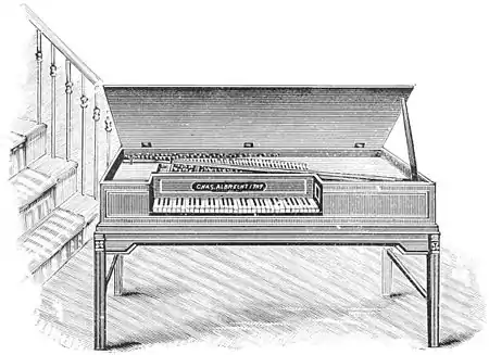 In 1775 John Behrent, of Philadelphia, announced that "he had finished an extraordinary instrument by the name of the piano-forte in mahogany, in the manner of the harpsichord." This was probably the first piano made in America. James Julian came forward in 1784, when the Revolutionary War had just been concluded, and advertised the great "American piano-forte of his own invention." In 1789 a piano-forte made by George Ulshofer, a German musician and musical instrument maker and repairer, was exhibited by him in Corre's City Tavern, New York. Some time before this year Charles Albrecht began making pianos in Philadelphia, many notable specimens of which exist to-day. One stands in the Art Rooms of the Philadelphia Historical Society, dated 1789, and another was presented by the late Mr. Drexel to the New York Museum of Art.