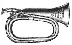 Fig. 9.—Duty Bugle, the Precursor of the Cornet. for it is too soft, subdued, and lacking in individuality to win a place as a solo instrument. The slide trombone and trumpet are equally ancient in their primitive shape. The former yet maintains a leading place. Besides the harmonics of the open tube referred to, intermediate semitones, so as to complete the range of the accepted octave, are easily produced in the trombone by means of the slide, which lengthens or decreases the tubing as required. Since valves were invented, they have been applied to the latter, but the slide trombone is yet preferred, owing to the superior purity of its tones.