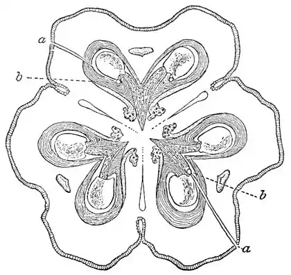 8.—Transverse Section of Pistil, about middle, one day after oviposition, showing (a, a) puncture of ovipositor, and (b, b) position of egg.
