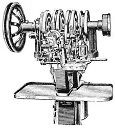 Fig. 7.—Goodyear Stitching Machine. This is one of the machines in what is termed the Goodyear welt system. be termed the epoch-making inventions. The first great step was made when the sewing machine was invented and the alert manufacturers were able to turn it to their purposes. But the distinction of the sewing machine does not belong to the shoe manufacturers. The invention, however, which did determine their future was that which led to the fastening of the sole of the shoe to the upper by machinery. The solution of this problem had been the real difficulty in the way of applying machinery to the work, and when it had been met the single-story shoe-shop had made way for the factory; its dozen journeymen had lost their individuality in the hundreds of operatives, and the pin-money which the wives of the farmers, or the farmers themselves, had made from the job-work doled out to them by the manufacturers had become a thing of the past. From that dates the shoe industry of to-day. From it also have come the growth and prosperity of important communities in Maine, New Hampshire, and Massachusetts, in New York, Pennsylvania, and the older West. As in the solution of most such problems, it was not hit upon at once. There were failures which were the forerunners of nothing, and failures which were the forerunners of success.