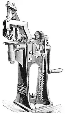 Fig. 12.—In-sole Channeler. sewing, the first mechanism for stitching the soles on lasted shoes. In Fig. 5, which represents a section of a boot, a is the upper, b the in-sole, and c the out-sole, while d is the welt, e the stitching of the sole to the welt, and f the stitching of the upper to the same. Following the process of lasting—that is, after the upper has been carefully drawn over the last—the welt is put in position around the sides up to the heel. The thin edge of this is then caught together with the upper and inner sole. The outsole is afterward tacked to the insole and, through a narrow channel made around the edges of it, sewed to the welt. The difficulties in the way of getting a machine which would do this, not simply as well as the hand, but do it at all, were many. The method which finally succeeded originated in a patent secured in 1862, by August Destory, for a curved-needle machine for sewing out-soles to the welts; but the machine did not work satisfactorily until it was taken in hand by Charles Goodyear, the son of the inventor of the India-rubber processes. This machine simply transforms the swinging movements of the hand and forearm in sewing into lateral and vertical ones, but the principle in the two operations is identical. There is one difference which in a way may be said to be even a point in favor of the machine sewing. In hand sewing the thread is drawn clear through its full length each time, and thus is weakened by constant wear. In the machine, only so much is drawn through as is necessary to form the stitch. These machines have been perfected and multiplied until what is known as the Goodyear system is the result. This system includes machines for sewing the welt on, attaching the sole to the upper, for lasting the upper, for