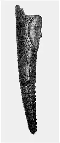 Fig. 9.—Carved Antler. Delaware Indian. too hard, easily shaped by hammering, its surface yielding to constant hammering with another stone. To shape a bit of wood is another matter, but that the Indian was abundantly capable of this, I offer Fig. 7 as evidence. Here we have an instance of the artist's skill in more than one direction. As we look at the illustration, we see the human face grotesquely represented, and at the same time the portrait is equally good, or almost so, of a barn owl (Strix pratincola). To accomplish this the artist must have had a clear conception of many of the rules of his profession.
