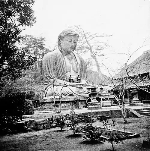 The Dai Butsu at Kamakura. This is the second largest figure of Buddha in Japan. It was formerly inclosed in a temple, but the latter was destroyed by an earthquake several centuries ago.