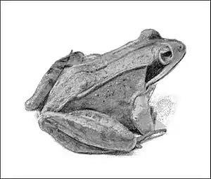 The ability of the tree frogs, or "tree toads" (Hylidæ), to change their color has long been known, but precise studies of the color changes of the common ground frogs (Ranidæ) have Fig. 1.—Wood Frog. Adult. only been made comparatively recently, and as yet the record is far from complete. A few years ago Dr. Fickert, of Tübingen, experimented with the color adaptability of the common European frog (Rana temporaria): "Three frogs approximately similar in color were placed in three glass vessels, of which the first stood on a black, the second on a green, and the third on a white surface, being surrounded up to a height of some five centimetres with the same color. After about an hour and a half the frog a on the black surface was the darkest, b on the white the lightest, while the frog c surrounded by green was intermediate in color between the two. Hereupon the frog a was transferred to the glass on the white, frog b into the one on the black surface. After three quarters of an hour they were again examined, and a was the lightest, b the darkest. Then c and b were interchanged, and in a quarter of an hour c was the darkest, while b was intermediate in color between c and a. When, finally, b and a were interchanged, a change of coloring appeared immediately; b became light again, and a took the intermediate tint between b and c."[1]