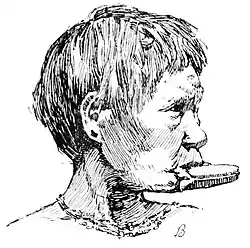 except with reference to their custom of wearing the large and broad lip and ear ornaments shown in the accompanying illustrations.