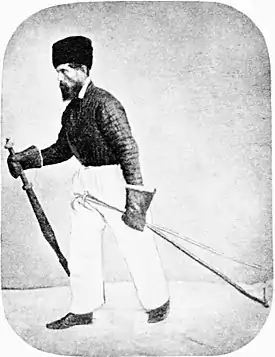 Let us now see how the fishermen dress for this winter fishing. One of them ready for work is represented in the picture. Light and comfortable garments, waterproof mittens and boots; in one hand a chisel, in the other two haft-hooks—the long one (with a haft of seven or more fathoms) is used for catching fish, lying (as a rule) in deep places on the bottom; the short one is destined to hold the fish when it is brought to the surface of the ice.