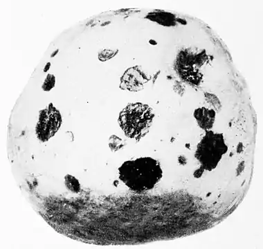 There are many diseases due to those exceedingly minute germs so widely talked of nowadays—namely, the bacteria. They attack animals and induce fevers of many sorts, and man sinks before them with the dreaded cholera, consumption, etc. Plants have their enemies among these micro-organisms, and apples do not enjoy an immunity from them. The succulent substance of a ripe apple is a favorite food for the bacteria, the only check upon their abundant entrance being the tough skin. But there are too many weak places, and it is presumable that these germs when falling upon them are capable of beginning their course of rapid multiplication which, when unchecked, reduces the fruit to rottenness. In Fig. 4 is seen an apple under the apparently unbroken skin of which in several places were decaying spots with no signs of any other mischief-makers than the swarming millions