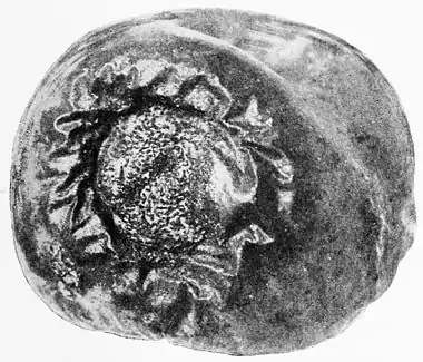 same fungus causes the rotting of the grapes, and, if all the facts were known, this Glœosporium fructigenum, Berk., might be definitely charged with a large percentage of the decay of other fruits. An apple badly affected with the bitter rot is shown in Fig. 5, but one regrets that many of the details are lost in the photo-engraving process by which the engraving was made.