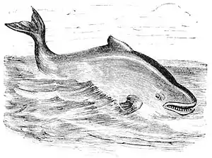 Fig. 3.—Common Porpoise. to this family, and probably suggested, as Wilson observes, by their mysterious appearance before and during storms, their great power of flight, and obscure habits. The superstitious mariner may indeed have regarded his little comrades not as harbingers merely, but as agents in league with the powers of darkness, directly concerned in bringing the storm. Mother Carey is the mater cara; so with the French these birds are "oiseaux de Notre Dame." The gigantic fulmar of the Pacific is known as "Mother Carey's goose," and hence the phrase "Mother Carey is plucking her goose"—that is, "it is snowing."