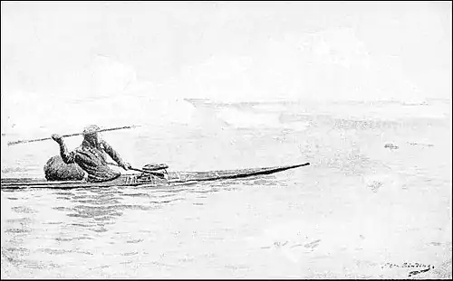 sounds between them, and the sea birds floating on the surface seem double their natural size. The kaiaks cut their way forward, side by side, making only a silent ripple; the paddles swing in an even rhythm, while the men keep up an unbroken stream