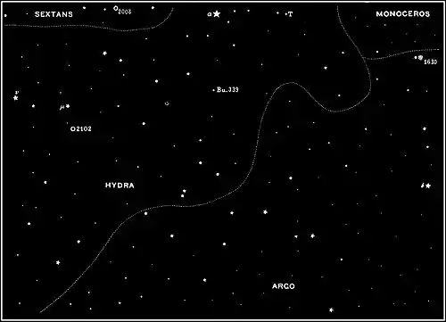 smaller component; the triple 35, magnitudes five, eight, and nine, distances 1·3″, p. 61°, and 28·7″, p. 124°, has for colors yellow, lilac, and blue, and the double 24, magnitudes five and six, distance 20″, p. 270°, combines an orange with a lilac star, a very striking and