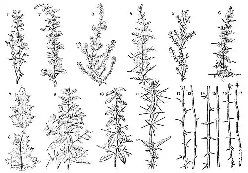 Plants with Thorns.—1 and 2, Berberis (barberry grown under moist and under dry conditions); 3 and 4, Genista or broom, moist and dry; 5 and 6, Ulex, or furze, moist and dry; 7 and 8, Cirsium, moist and dry; 9 and 10, Pyracantha, moist and dry; 11, Xanthium, upper sprig moist, lower sprig dry; 12 and 13, Gleditscha, or honey locust, grown in the sun and in the shade; 14 and 15, Robinia, or locust, grown in the sun and in the shade; 16 and 17, Rosa, grown in the sun and in the shade.