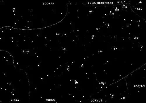 Another double that perhaps we had better not try with less than four inches aperture is 84 Virginis. The magnitudes are six and nine; distance, 3·5″, p. 233°. Colors, yellow and blue. ∑ 1846