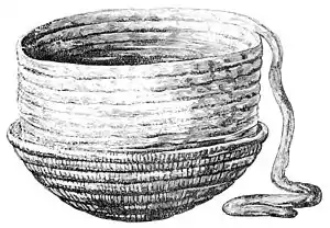 Fig. 6.—Making Coiled Ware in Basket Bowl. (After Cushing.) the hoe-shaped scraper for splitting the skin; and the grainer, a hoe or chisel-like tool with serrated edge to roughen up the inner side of the robe and give it flexibility. Besides these, both Eskimo and Indian had hands and feet and teeth for pulling and pounding and breaking the grain. They had also a wonderful supply of pride in their work, and love of applause, which kept them up to the mark of doing the best that could be done with their, resources." The scraper is the oldest instrument of any craft in the world. The Indian women of Montana still receive their trade from their mothers, and they, in turn, were taught by theirs in unbroken succession since the