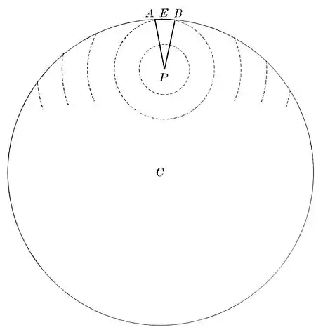 Fig. 2.—P, point of origin of earthquake shock; E (epicentrum), point on the surface directly over it; A, B, limits of the area of vertical, simultaneous, and earliest shock.