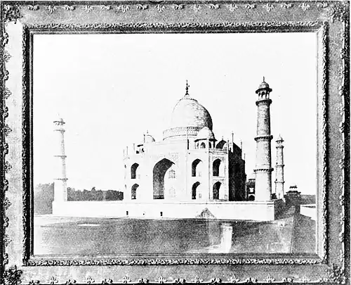 That astigmatism distorts objects can be easily demonstrated. It is well known that the structure of the human eye is practically the same as that of the photographer's camera. Ordinarily the image which falls on the glass plate of the camera is equally clear in every part, because the lenses in front are ground with spherical surfaces. Such a camera when properly directed at a picture like that of the Taj Mahal, for example, gives us on the glass plate a clear and undistorted image of the building, such as is seen in Fig. 1. If, now, we render the front glass of the camera slightly astigmatic, by placing in front of it a so-called cylindrical glass with the axis horizontal, it produces optically exactly the same effect as that obtained when the globe of the eye is pressed from above downward. Moreover, the degree of this distortion in any eye can be reproduced with perfect exactness by placing in front of the camera a cylindrical glass of proper strength. It will be remembered that the average degree of astigmatism with the artist's examined was found to be