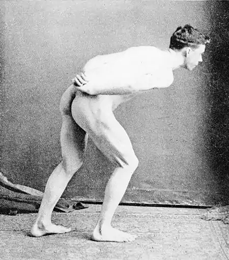 long, as are also his legs. His feet are large and flat. His weak points are his calves, due to the long, fiat skate to which his flattened foot is so closely bound. The large muscles of his chest are not exercised, and his arms, held lying idly along his back, are unused except in an occasional spurt, when they are brought down and swung straight from the shoulder. They say that they catch less wind held that way, and that the position is restful to the tense extensors of the back. This is, no doubt, true, but the result is