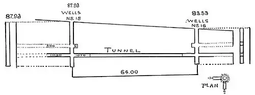the sea and fifty-two metres above the bottom of Lake Copais. Across this depression, from near the openings of the Katabothra of Bynia in the Bay of Kephalari, runs a line of ancient wells or shafts in a general direction from southwest to northeast, not in a straight line, but following the contour of the hill, ending on the east side not far from where the katabothra opens into the Valley of Larymna. There are sixteen of these wells, cut through the hard, gray limestone of which the mountain is composed, and carefully squared, with an average horizontal section of three to four metres. The first shaft, on the west side, is five hundred metres from the lake; the sixteenth, on the east side, two hundred and twenty-five metres from the opening. The wells are at an average distance from each other of about one hundred and sixty metres, and the whole distance from opening to opening is about twenty-four hundred metres.