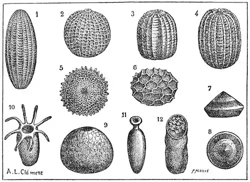 Figs. 1 and 2, eggs of the large and of the small cabbage Pieris; Fig. 3, egg of the Tristan butterfly (Papillo hyperantus); Fig. 4, egg of the admiral (Vanessa atalanta); Figs. 5 and 6, eggs of Polyommatus; Figs. 7 and 8, eggs of Dicranitra vinula, profile and front views; Fig. 9, egg of Pygaera tricephala; Fig. 10, egg of water scorpion (after Swammerdam); Fig. 11, egg of gnat; Fig. 12. nit of the louse (after Swammerdam, greatly magnified).