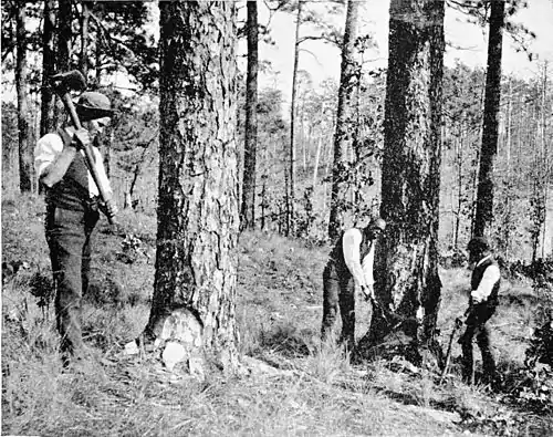 great pine forests as "turpentine farms," although some people refer to them as "turpentine orchards." The word "crop" has a special meaning. When a turpentine farmer speaks of his crop he means ten thousand boxes. This will be about five thousand trees, as from two to four boxes are cut in full-grown trees.