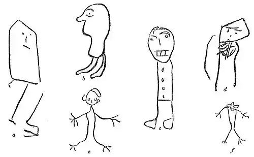 a horizontal line across them and so making a rectangle, as in the accompanying drawing by a boy of six, or by shading in the upper part of the space, as in the other figure by a girl of five (Fig. 13, c and d). A curious and interesting variant of this second mode of introducing the trunk is to be found in the drawings of den Steinen's Brazilians, where the leg lines are either kept parallel for a while and then made to diverge, or are pinched in below what may be called the pelvis, though not completely joined (Fig. 13, e and f).