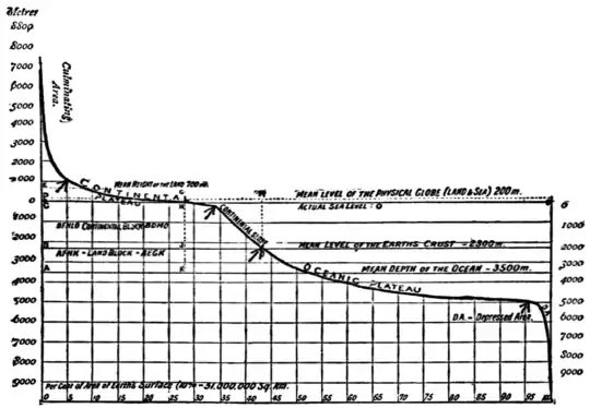 altitude classification of the earth's surface, which he divides into five regions, as follows: The culminating area of the earth's crust, occupying six per cent of the surface and lying altogether above 1,000 metres, with a mean height of 2,200 metres (or 7,200 feet) above the sea. The continental plateau, occupying all the surface from the 1,000 metre contour line of elevation to the 200 metre contour line of depth—i. e., to the margin of the shallow sea border or continental shelf; it comprises 28·3 per cent of the surface, and has a mean elevation of 250 metres (800 feet) above the sea. The continental slope, from a depth of 200 metres to 2,300 below sea level, covers nine per cent of the earth's surface, and has a mean depth of 1,300 metres (4,300 feet). The oceanic plateau, between the depths of 2,300 and 5,000 metres, occupies no less than 57·3 per cent of the surface, and has a mean depth of 4,100 metres (13,500 feet). Finally, the depressed area, deeper than 5,000 metres, is assumed to occupy three per cent of the surface, with a mean depth of 6,000 metres (say 20,000 feet). The mean level of the surface of the earth's crust is placed by these calculations at a depth of 2,300 metres, or 7,500 feet, below actual sea level. The total area of land is worked out at 28·3 per cent and that of sea at 71·7 per cent of the earth's surface; the ratio of land to water surface is thus 1: 2·54. The accompanying chart is reproduced from Nature of June 4th.