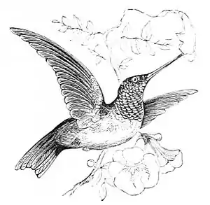person. He comes so suddenly as to give no warning to the eye; we hear a buzz, see the bird near us stationary, his form distinct, and when he leaves, so quick and sudden is his flight, that the eye can scarcely trace his pathway. The muscles of his wings are more powerful and active, in proportion to his size, than those of any other bird, and the wings are very long and sharp. For this reason he can easily hover, apparently motionless, for any length of time, before a flower whose honey he wishes to obtain. He thus sips the nectar of one flower after another for hours in succession, without showing any signs of weariness, or disturbing in the least the most delicate blossom.