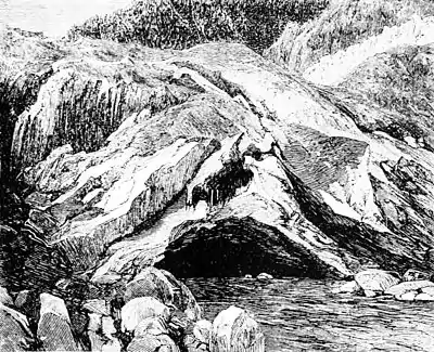 is shown the source of the Arveiron and the sublime view of the foot of the glacier whence it issues. Of this M. Rendu says, "It is a vast portico more than a hundred feet high, let into an immense façade, and surmounted by lofty pyramids of ice. Nothing is more astonishing than this work of the elements, of which Nature alone has conceived the plan, and achieved the construction."
