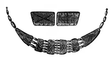 Everywhere and always man has sought to embellish himself. Sometimes by acting on himself, sometimes by borrowing the elements of his dress from without. In the tombs discovered from time to time which inclose the remains of men with their stone hatchets, used in France against the elephant and rhinoceros, in those tombs, I say, we find collars (Fig. 6) made of morsels of shells or small corals