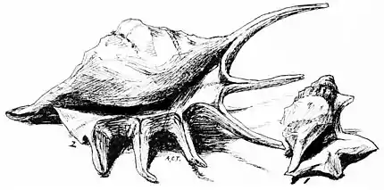 | Pterocera lambis, showing prongs made by mantle. | Pelican's Foot (Aporrhaispes pelicani). | |