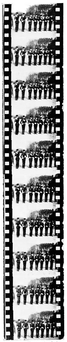 A squad of soldiers at drill. |} Chief among these causes must be mentioned the use of faulty apparatus and of films of inferior quality, or which have become worn by frequent and prolonged use. Minor blemishes are, however, of common occurrence, even when the best obtainable apparatus and materials are used for the purpose. These are referable chiefly to defects in the sensitized films of celluloid. But there is no reason to doubt that better films can be produced, and that pictures of this nature will ultimately be rendered as free from defects as are ordinary stereopticon views.
