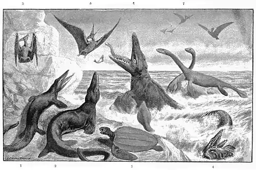 Mossaurs; 1, Platecarpus coryphœus (Cope); 2, Tylosaurus Proriger (Cope); 6, Mosasauris Horridus (Williston); all restored by Williston. 3, Marine turtle: Protostega gigas (Cope), restored by Case. 4, Bulldog fish: Portheus Molossus (Cope). 5, Pterosaur: Pteranodon, or Ornithostoma ingens (Marsh), restored by Williston. 7, Plesiosaur: Plotycotylus latipinnis, as restored by Dames.