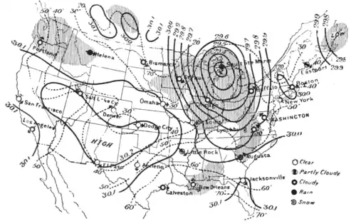 of Montana, and they follow either of two well-defined paths in their eastern course. One path leads southeasterly to the Georgia coast, from which locality the high follows the warm, moist air over the Gulf Stream to the Gulf of St. Lawrence, there to pass beyond our observation (Fig. 3). The other path extends across the Great