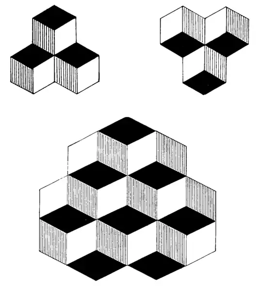 Figs. 17, 17a, and 17b.—How many blocks are there in this pile? Six or seven? Note the change in arrangement of the blocks as they change in number from six to seven. This change is illustrated in the text. Figs. 17a and 17b show the two phases of a group of any three of the blocks. The arrangement of a pyramid of six blocks seems the more stable and is usually first suggested; but hold the page inverted, and you will probably see the alternate arrangement (with, however, the black surfaces still forming the tops). And once knowing what to look for, you will very likely be able to see either arrangement, whether the diagram be held inverted or not. This method of viewing the figures upside down and in other positions is also suggested to bring out the changes indicated in Figs. 13, 13a, 13b, and in Figs. 15, 15a, 15b.